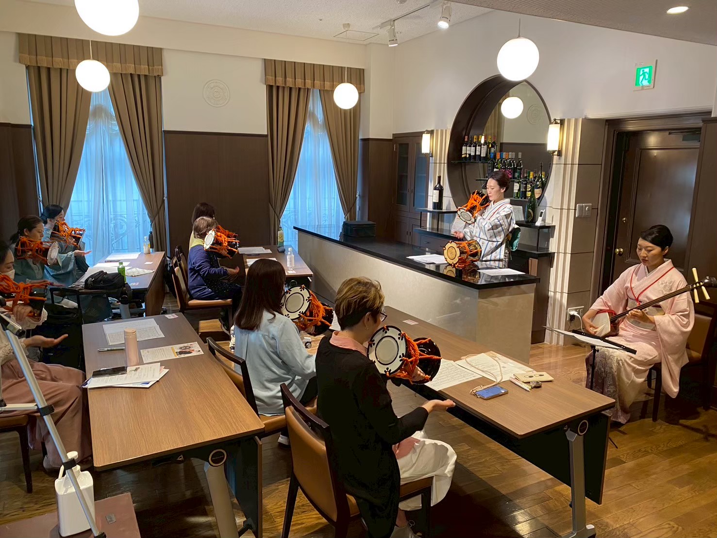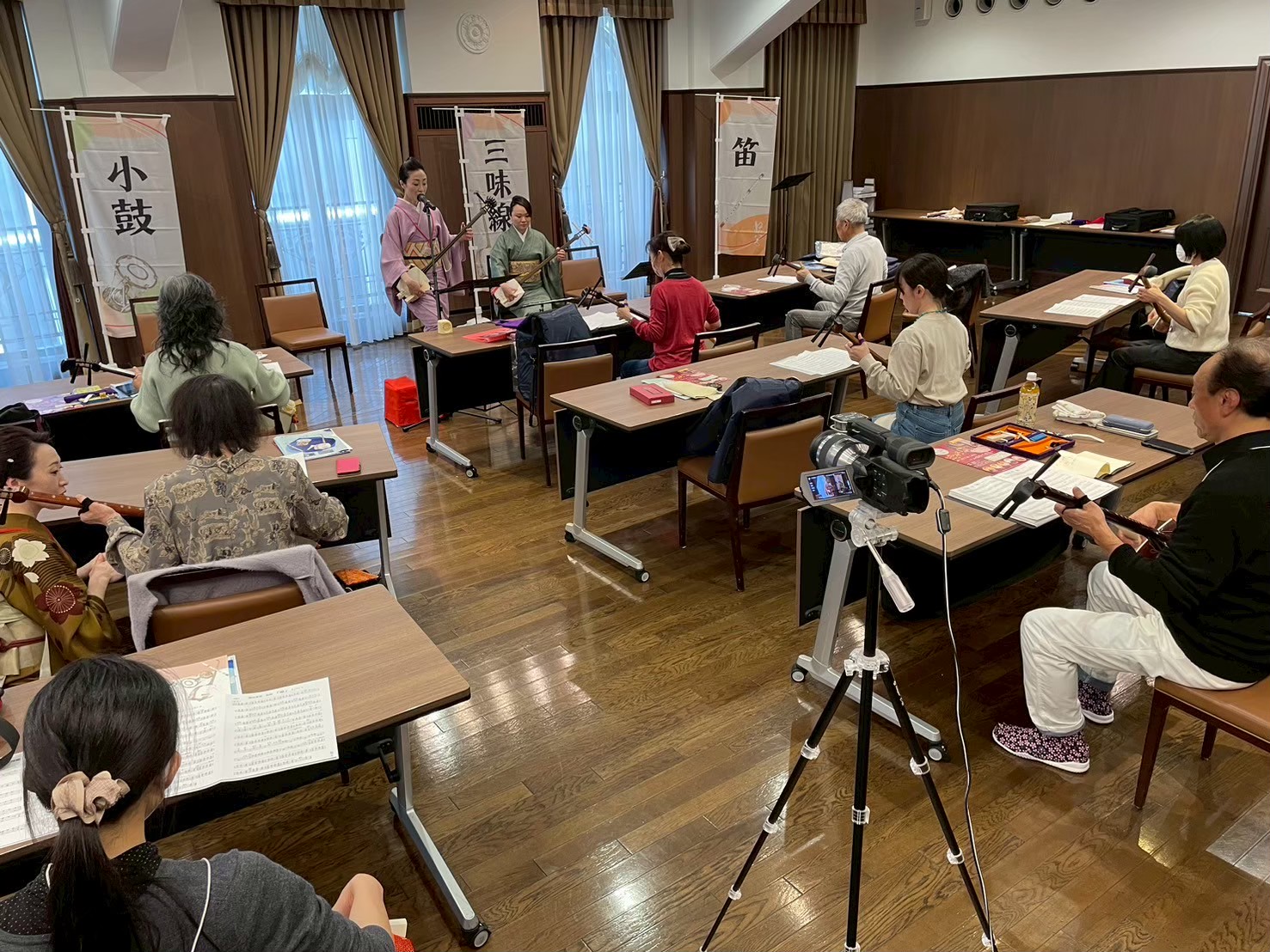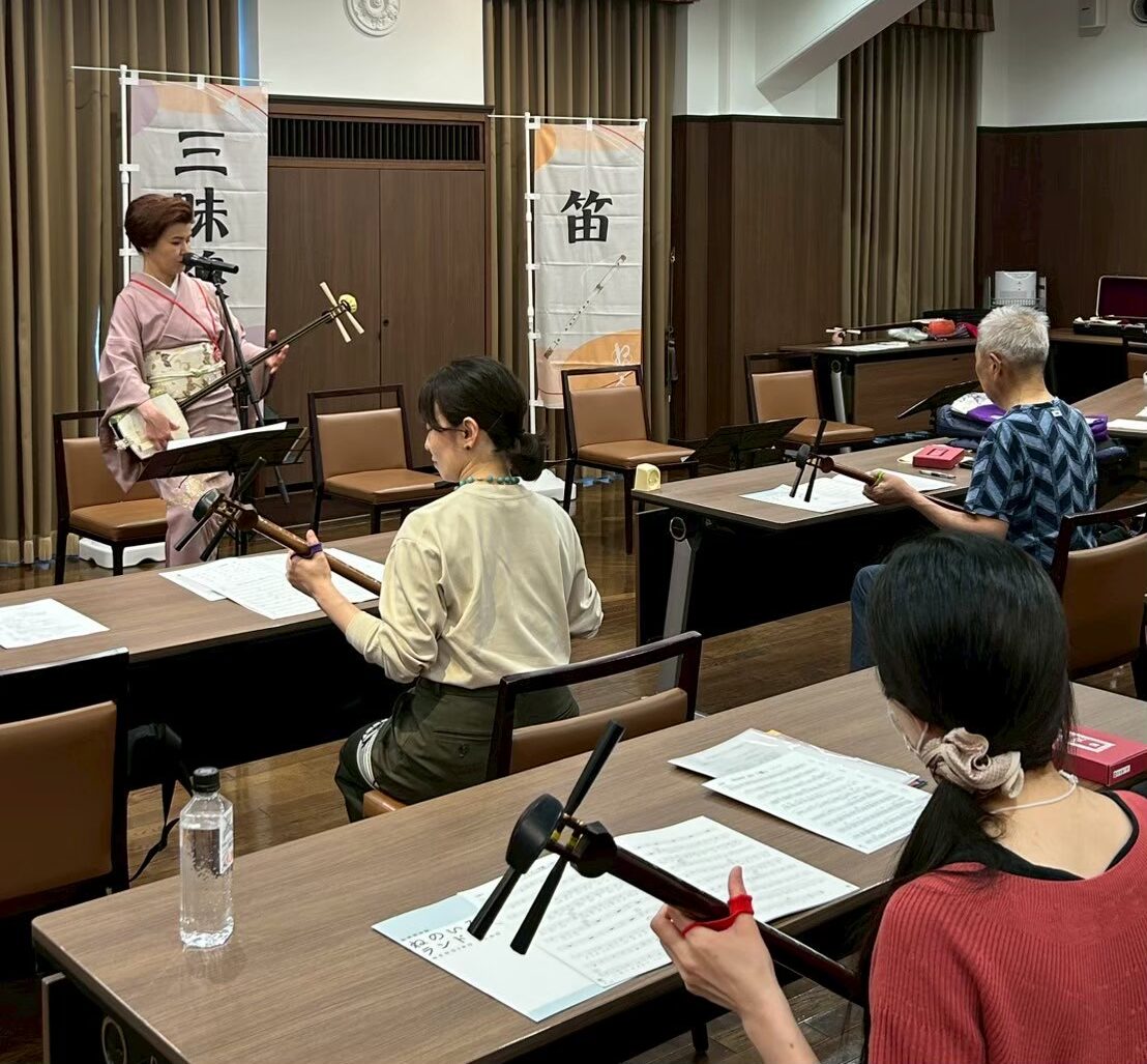 三味線クラス、小鼓クラス、笛クラス、それぞれ本格的な古典からポップス、オリジナル曲まで